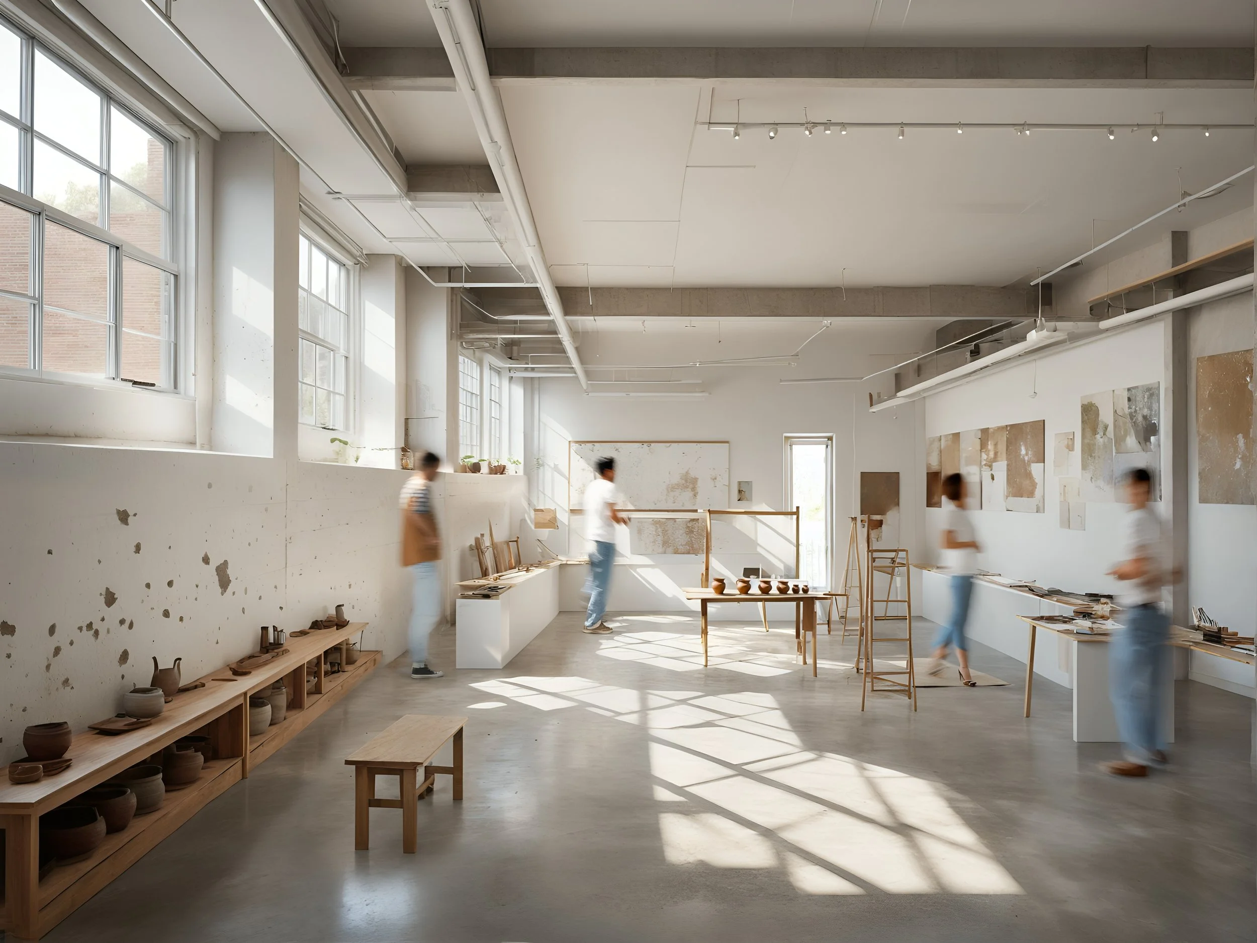 The design responds with a thoughtful and restrained approach, respecting the integrity of the historic building while adapting it for diverse artistic disciplines. Studios are intentionally raw and minimal, retaining layers of texture and history. Spaces are open and flexible to accommodate evolving programs, with an emphasis on repurposed and reused materials wherever possible. Light becomes a defining element, with the design centered around the theater’s generous exterior windows to create bright, welcoming workspaces.